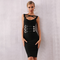 The dress features sexy cutout inserts, high neck and long sleeves. This little bandage dress is sure to turn heads and make an impression!