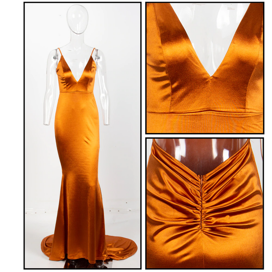 Rivicouture Featuring fanciable Deep V-Neck Open Back Slim Long Dress -orange