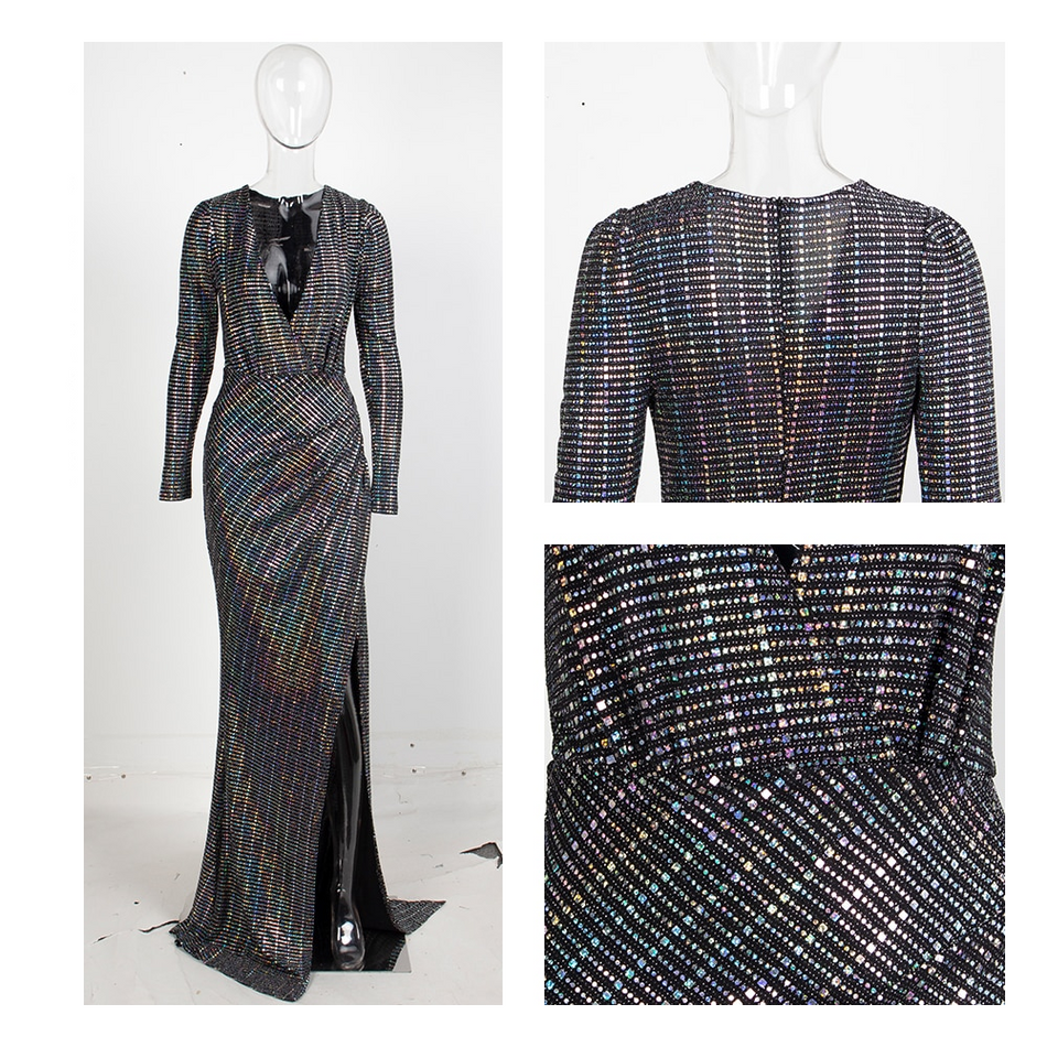 Rivicouture Featuring fanciable shiny Deep V-Neck Cut Out Puff Sleeves Glitter Sequins Elastic Material Maxi Dress